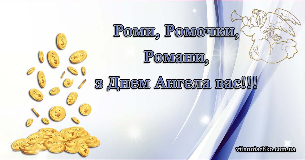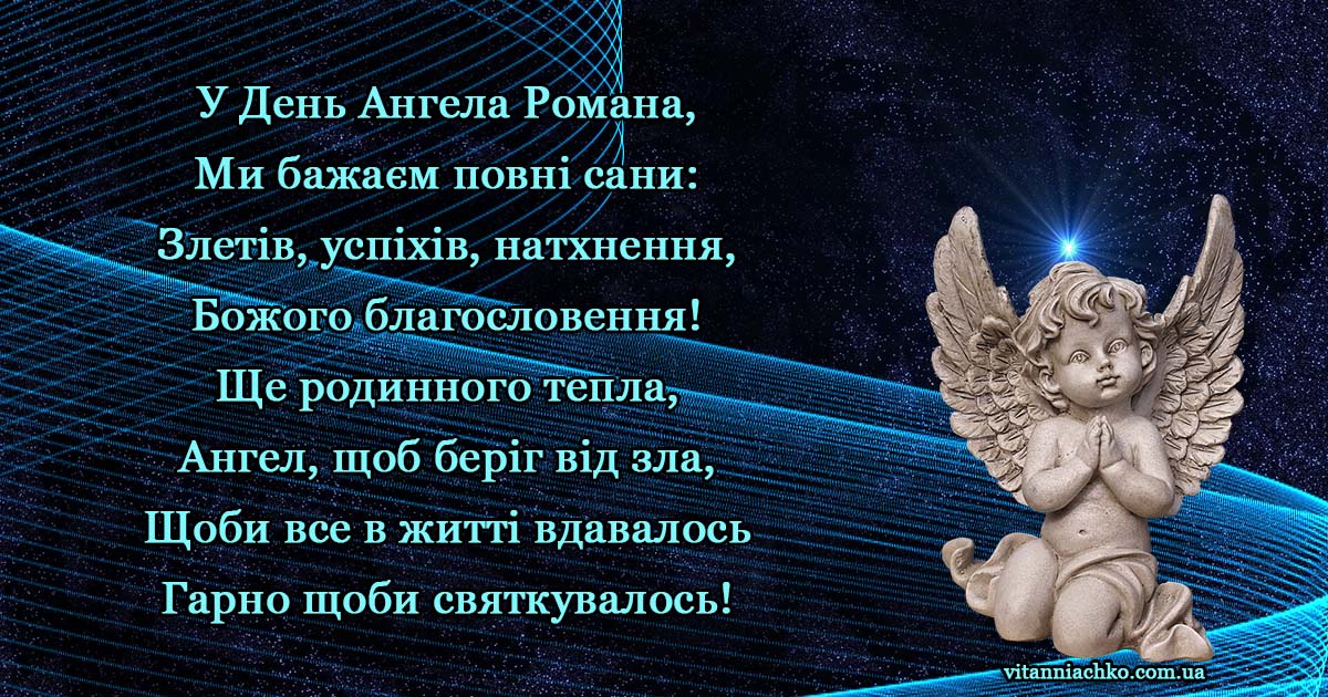 Іменини: 18 січня, 11 та 16 лютого, 2 та 29 березня, 15 травня, 5 та 13 червня, 1 , 6 , 11 , 15 та 23 серпня, 8, 16 та 24 вересня, 8 та 14 жовтня, 13 листопада, 1 та 10 грудняВірші для привітання з Днем Ангела (іменинами) Романа