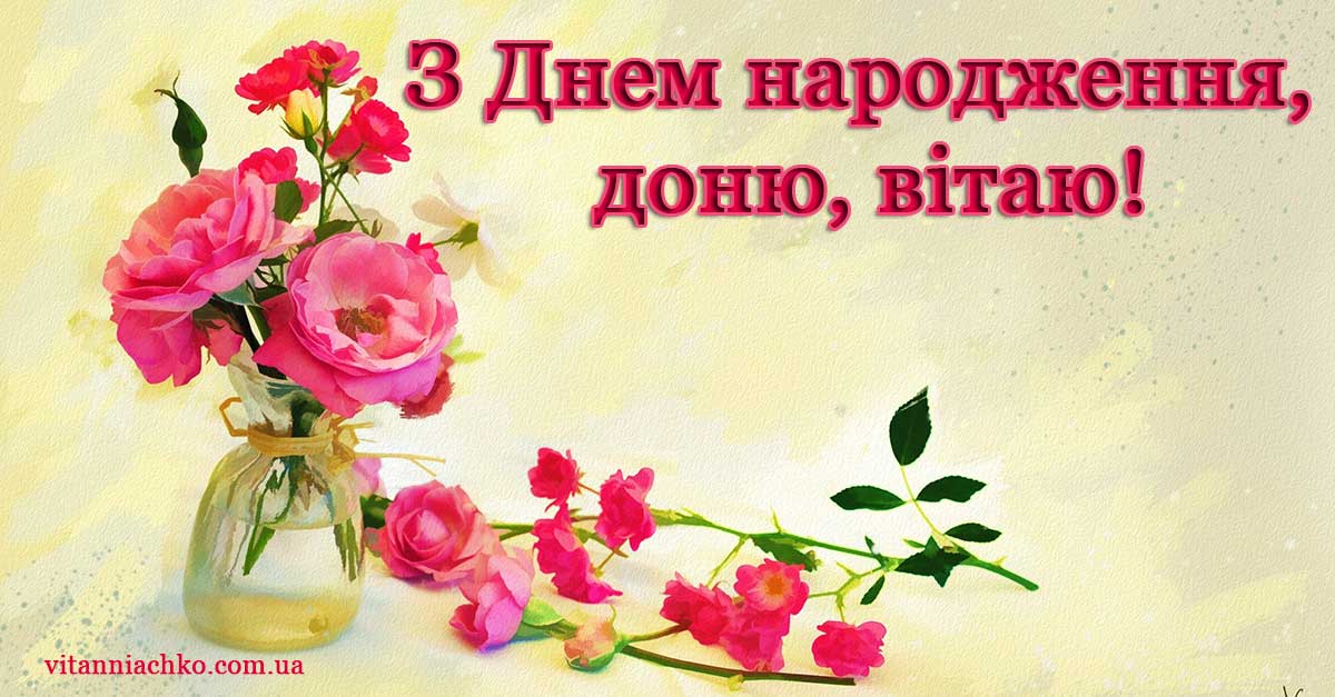 Дорога доню, вітаю тебе з днем народження і бажаю тобі всього, що потрібно для щастя: взаємного кохання, міцного здоров'я тобі та твоїй сім'ї, доброго достатку та виконання всіх твоїх бажань! Нехай у тебе, кохана, завжди буде безліч приводів для щирої усмішки!