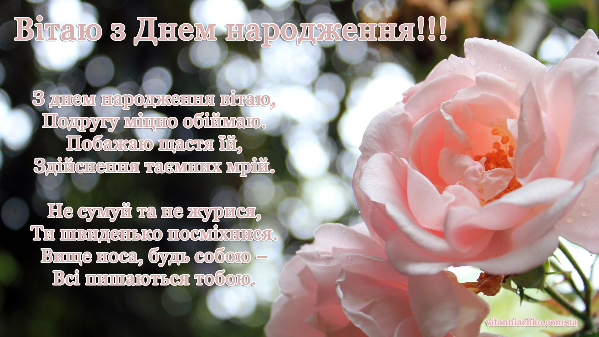 З днем народження, мила подруга! Бажаю тобі завжди йти по життю з посмішкою. Нехай у всіх твоїх починаннях тебе супроводжує успіх. Безмірного щастя, міцного здоров'я і палкого кохання. Нехай невдачі обходять тебе стороною, а гармонія і радість не покидає тебе. Бажаю тобі завжди залишатися собою і не зупинятися на досягнутому. Нехай промені сонця увірвуться в твоє життя з шаленою швидкістю і обдарують тебе теплом і світлом. Бажаю тільки білих смуг в житті. Нехай на твоєму шляху зустрічаються тільки хороші люди. Люби і будь любима!
