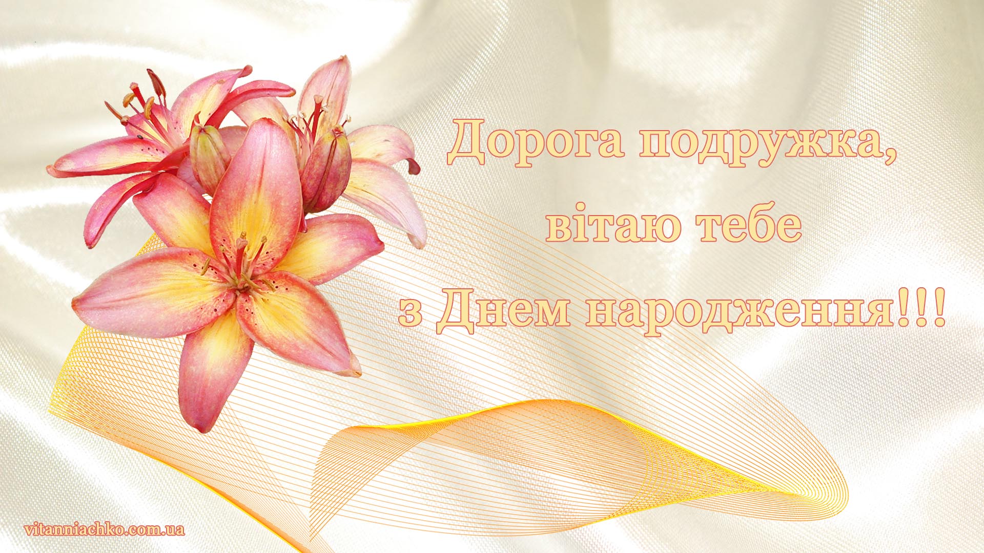 Дорога і улюблена подруга, прийми мої вітання з днем народження! Перш за все, хочу побажати тобі безмежного людського і, головне, жіночого щастя. Завжди залишайся такою ж життєрадісною, оптимістичною і енергійною. Нехай все те добро і підтримка, які ти випромінюєш, повернуться до тебе в стократному розмірі. Нехай поруч завжди будуть знаходитися твої рідні і близькі, які будуть надихати тебе і допомагати здійснювати твої мрії. Через кілька десятків років я сподіваюся побачити тебе такою ж щасливою і сповненою натхнення, як і сьогодні.