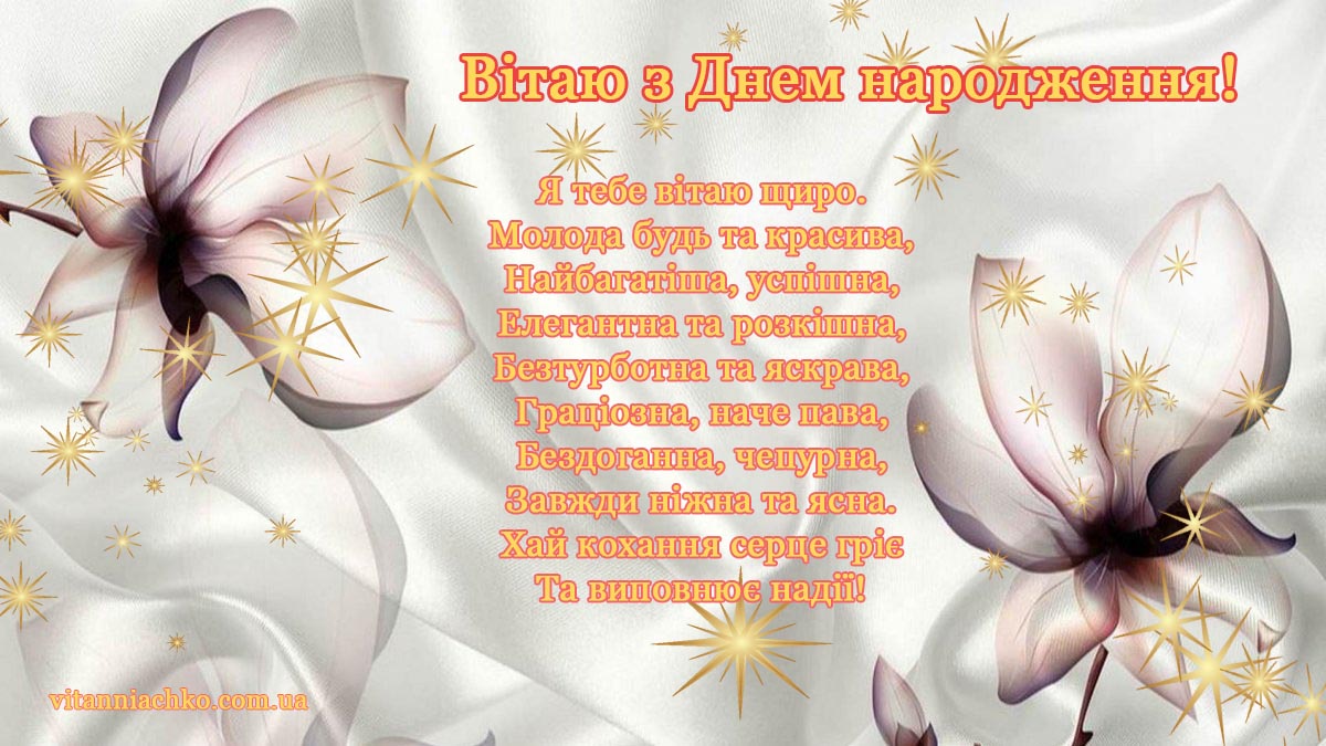 Бажаю тобі в твій день народження подивитися новим поглядом на свої проблеми і досягнення, подумати тільки про хороше і забути про погане. Набери повні груди оптимізму і повір: все, що тобі заважає, насправді допомагає - допомагає рухатися в правильному напрямку! Не переживай через дрібниці, частіше хвали себе і пам'ятай, що ти - найчудовіша!