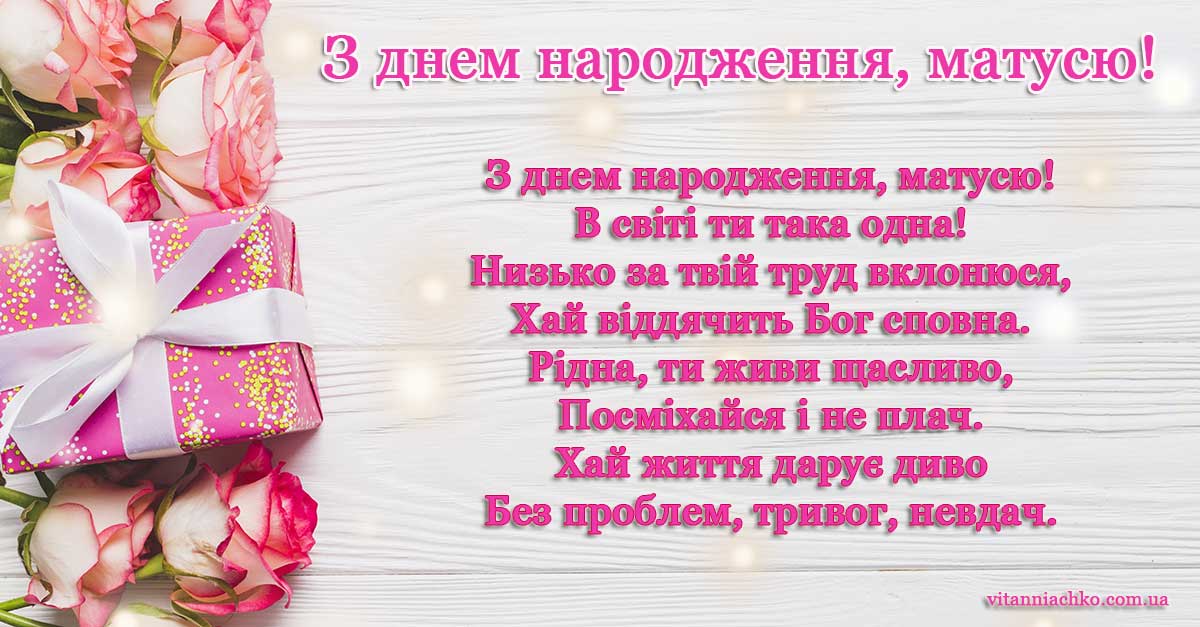 З днем народження, матусю моя! Тобі, моя рідна, щиро хочу побажати здоров'я, величезного щастя, терпіння, щоб більше відпочивала і більше посміхалася. Щоб твої роки ніколи не відбивалися на твоєму обличчі, ти завжди почувала себе молодою душею та тілом. Ніколи не сумуй, знай, що я завжди буду поряд. З днем народження, мамо моя!