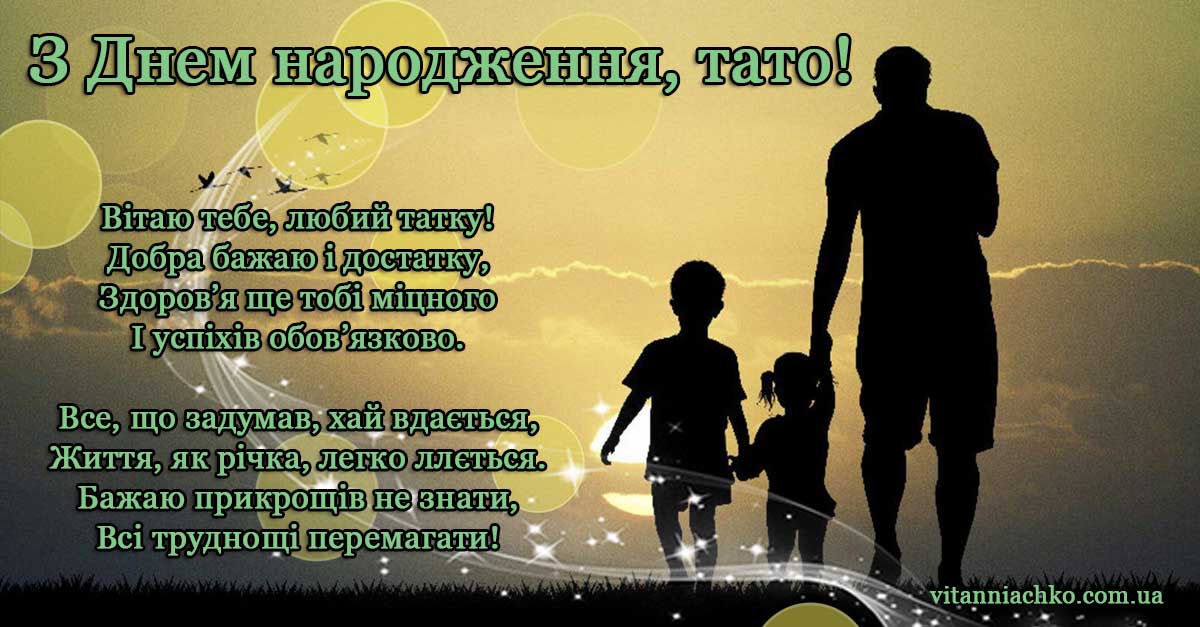 Татку мій любий, вітаю тебе з днем твого народження! Побажаю тобі прожити багато довгих та благополучних років. Бути завжди добрим, справедливим та чесним. А ще побажаю, щоб твоє здоров'я тебе ніколи підводило та надавало тобі життєрадісності та сил. Щоб тебе любили та поважали близькі та друзі. Батьку, бажаю також тобі радості та свята у твоїй душі не лише цього дня. Нехай життя тішить тебе твоїми перемогами. Папуля, я тебе люблю!
