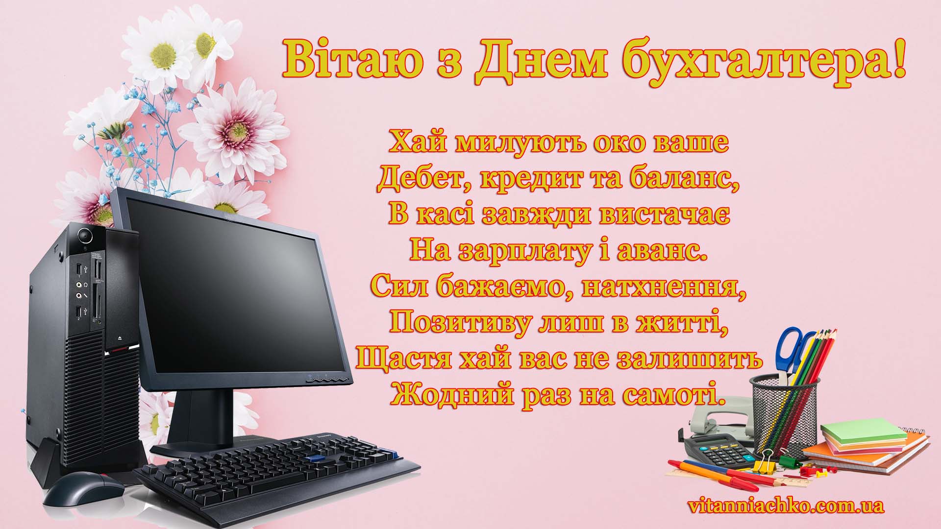 З днем бухгалтера. Нехай дебет із кредитом не сваряться, нехай робота завжди ладнається, нехай удача підтримує в будь-якій ситуації, нехай успіх ніколи не покине тебе. Від душі бажаю безхмарного щастя, унікальних можливостей, харизми та оптимізму, геніальних ідей, ангельського терпіння та натхнення, любові рідних, працьовитості та впевненості, природних емоцій радості, розкоші та благополуччя у житті.