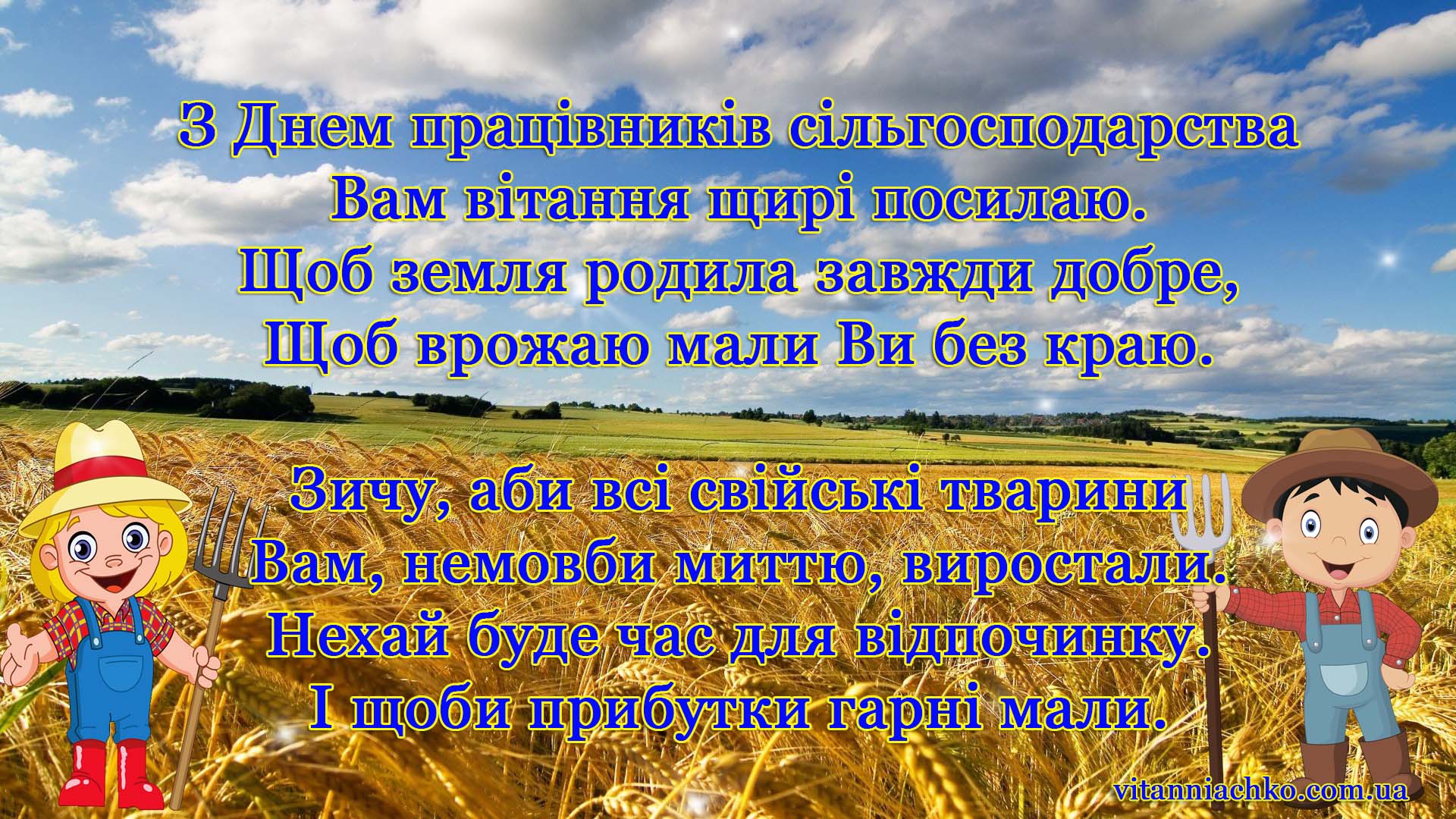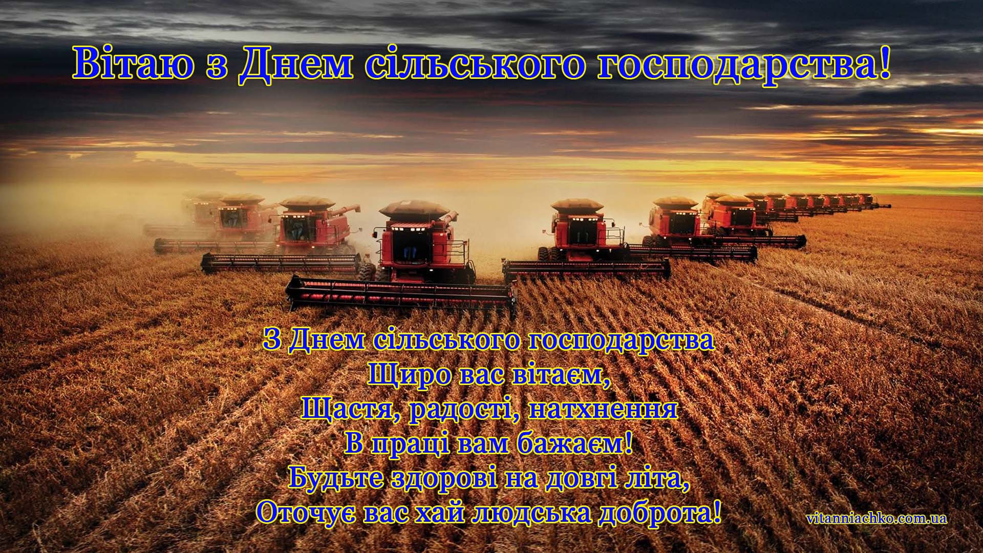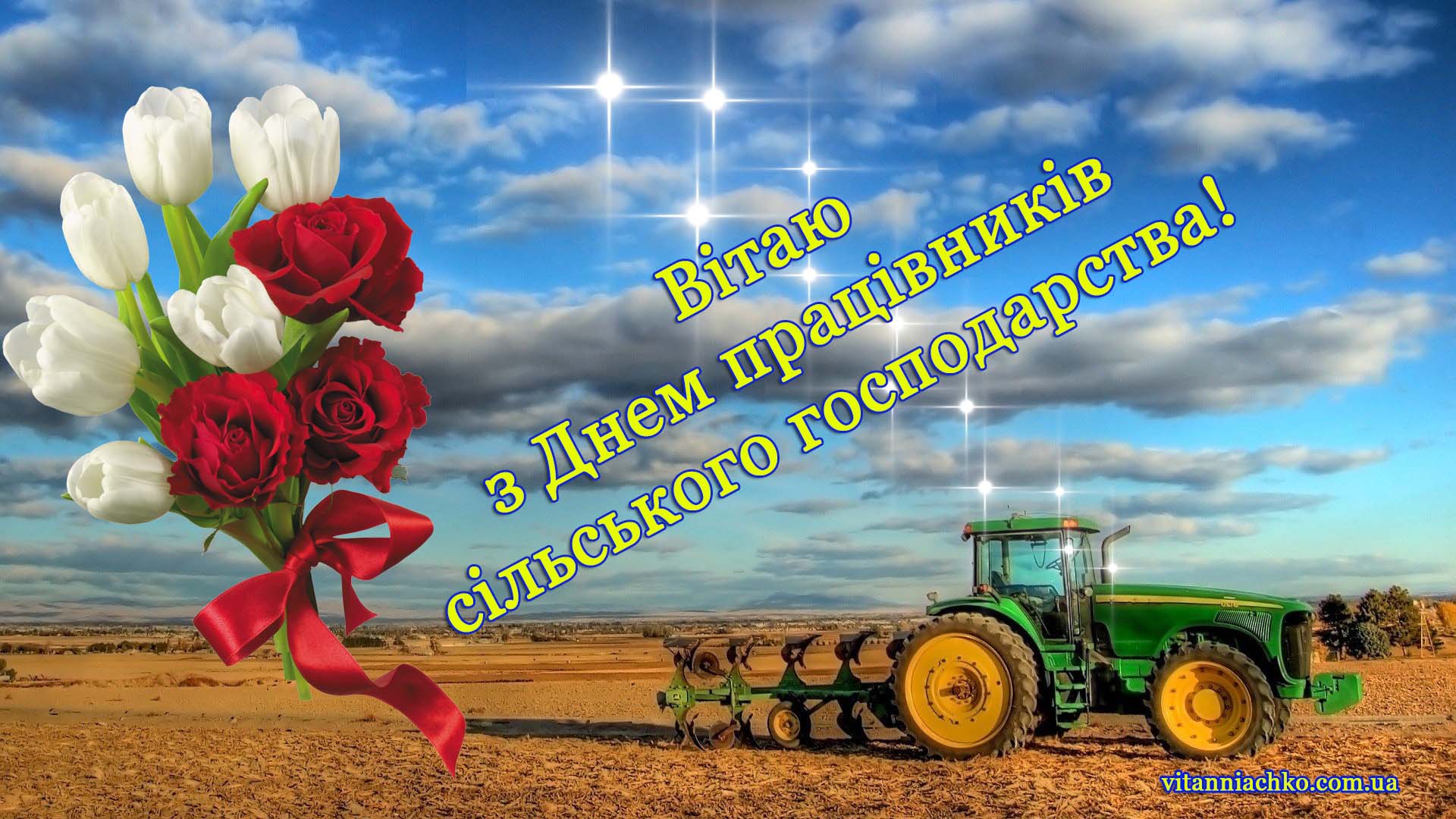 Сердечно вітаю із Днем працівника сільського господарства. Бажаю гучних успіхів та чудових досягнень у діяльності, благополучної та старанної роботи, високого достатку та приголомшливих можливостей, міцного здоров'я та впевнених сил, поваги та вірної удачі, світлого щастя та добра.