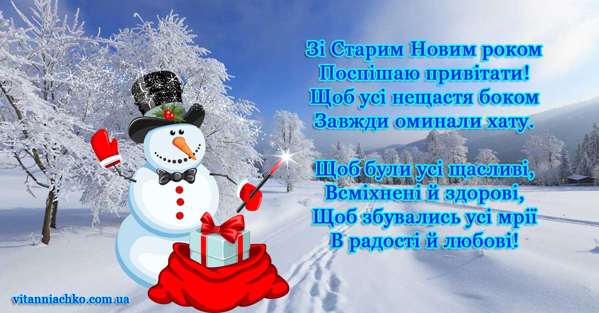 Вітаю зі старим Новим Роком! Нехай цього року все старе, що тішило вас, залишиться, а водночас прийде безліч нового — нові емоції, почуття, враження, нові радощі та нові перемоги. Нехай з цього моменту в подальшому вашому житті відбуваються лише щасливі події, а в домі нехай завжди звучить радісний та дзвінкий сміх.